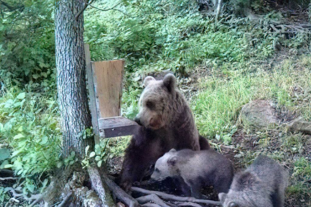 Un’orsa con i cuccioli fotografata alle mangiatoie per cervi e caprioli: il Wwf chiede lo stop al foraggiamento